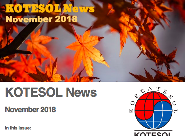 The November 2018 issue of KOTESOL News was sent on November 1, 2018, to nearly 2,000 subscribers. Learn about the latest KOTESOL happenings and events; read, share, or subscribe here.