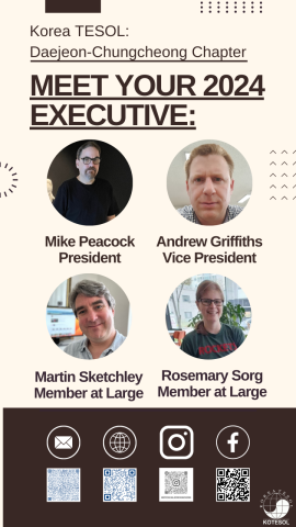 By Webeditor Daejeon on January 1, 2024 - 7:53pm | Reads | NewsDaejeon-Chungcheong Meet your 2024 Executive! President: Mike Peacock Vice President: Andrew Griffiths Member at Large: Martin Sketchley Member at Large: Hai Xia Song Share this page