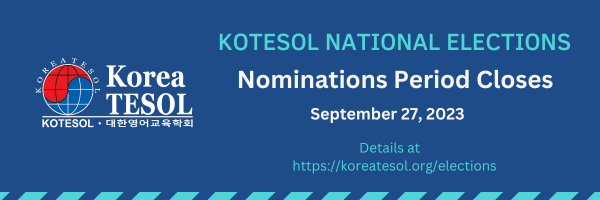 Nominations for Korea TESOL's national elected officers are ending very soon: September 27, 2023, just before Chuseok begins. For details on KOTESOL nominations and elections, visit the Nominations and Elections Committee pages at http://www.koreatesol.org/elections.