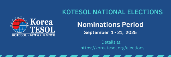 Nominations for elected National Council positions are open during the period September 1-21, 2025. For details, go to the Nomination and Elections pages at https://koreatesol.org/elections.