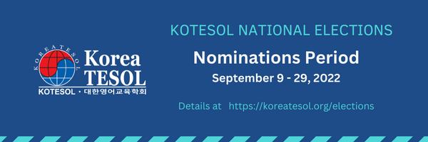 Nominations for elected National Council positions is now open and will remain open through September 29, 2022. For details, go to the Nomination and Elections pages at https://koreatesol.org/elections