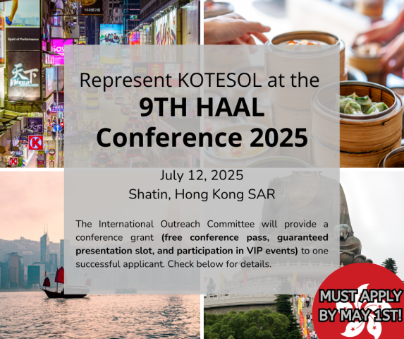 The International Outreach Committee is looking for a representative to travel to Hong Kong for the upcoming Hong Kong Association of Applied Linguistics conference this July!