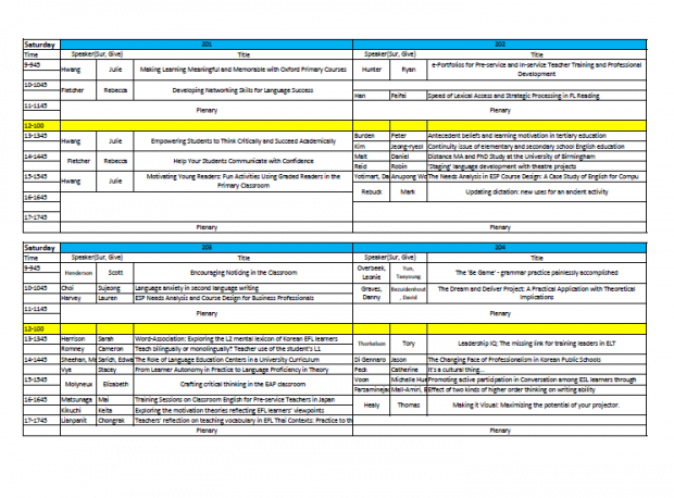 The timetable you've been waiting for is now available. It's even a few days ahead of schedule! Rooms and Times (Saturday and Sunday) for all concurrent sessions have been uploaded to the Conference Program page. http://www.koreatesol.org/content/program