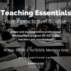 Throughout the month of May, KOTESOL members can get TWO online professional development courses for the price of one from Caprica Education! Courses are self-paced, so you can progress at your convenience, and they generally take 4-6 weeks to complete. Particularly of interest to KOTESOL members who need evidence of accumulated professional development time: all courses come with certificates of achievement that list the number of hours of study (along with your name, skills developed, and place of issue). Learn more here!